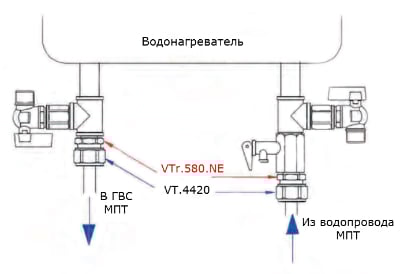 Примеры использования соединителя VTr.580.NE в обвязке водонагревателя и коллектора: