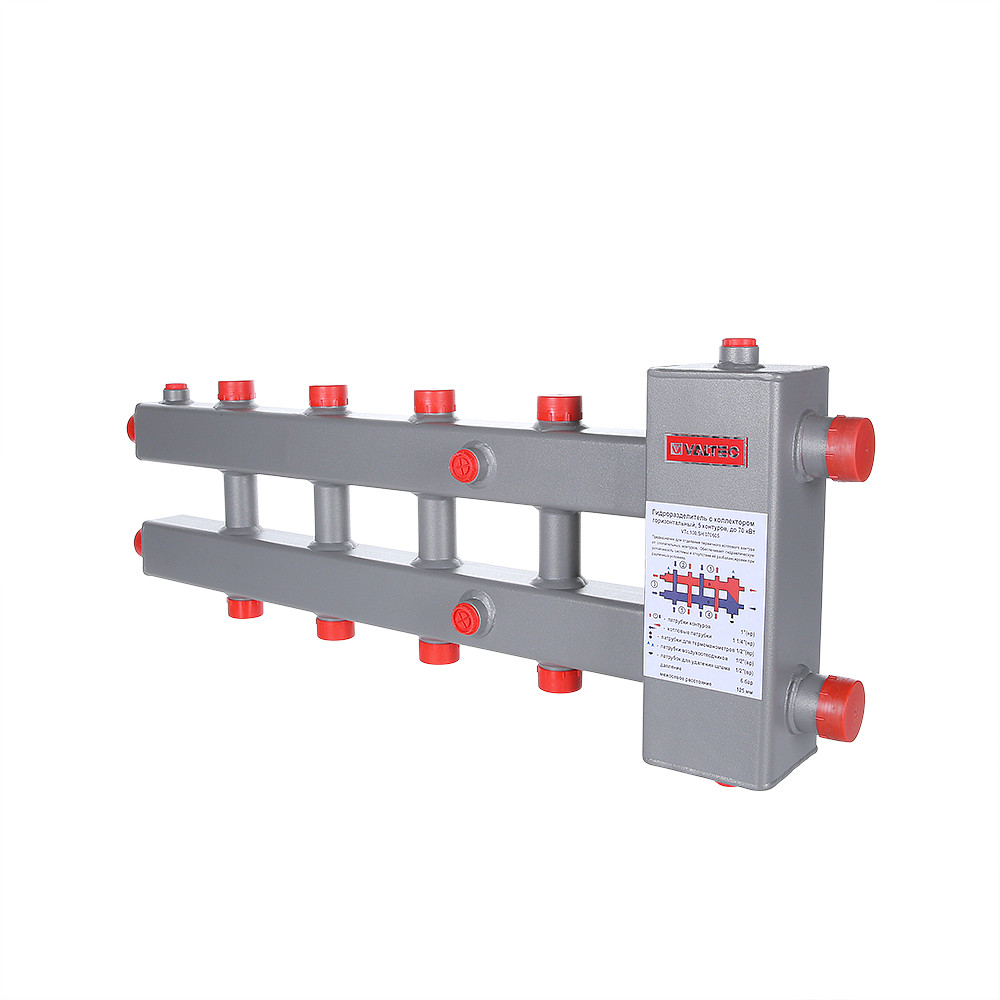Серия VTc.100.SH включает в себя горизонтальные гидроразделители с возможностью подключения трех и пяти контуров.
