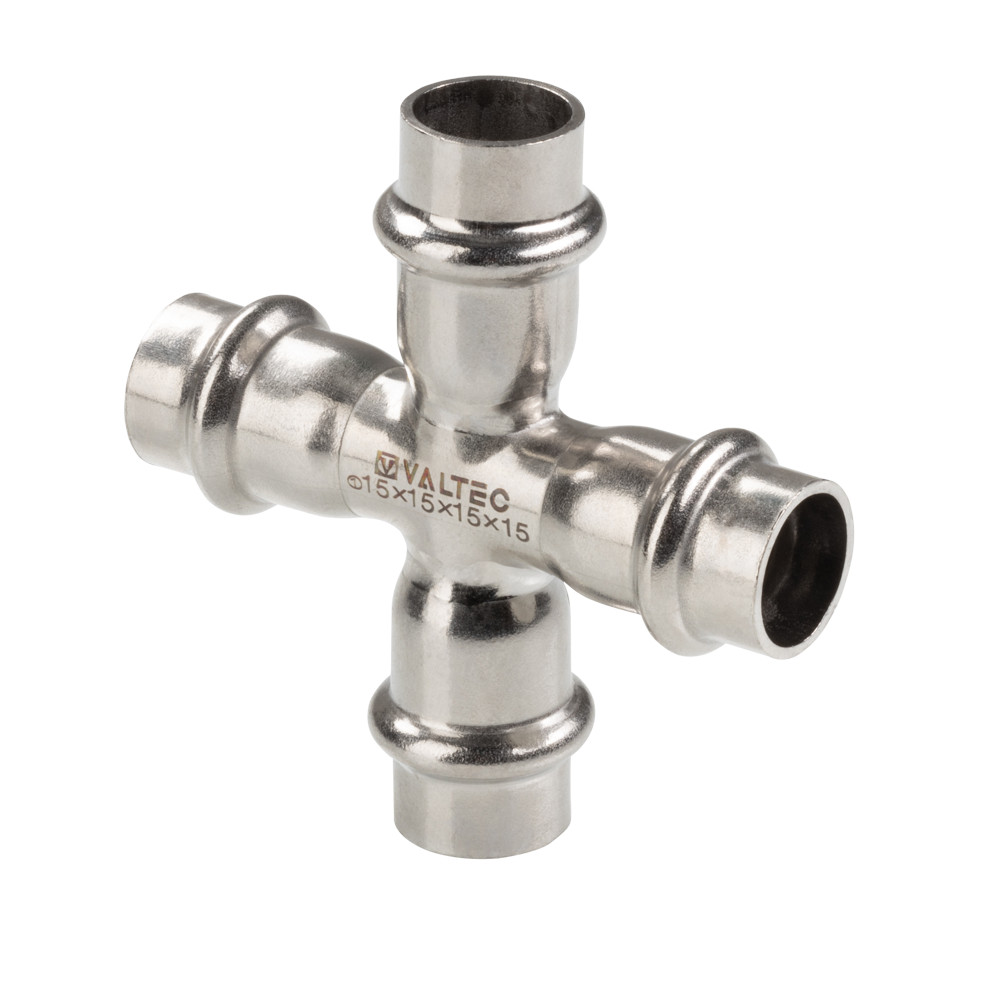 (VTi.941.I) Пресс-крестовина из нержавеющей стали VTi.941.I обеспечивает соединение четырех тонкостенных стальных труб систем водоснабжения, отопления, иных инженерных и технологических установок с рабочей температурой до 120 °С и давлением до 16 бар.