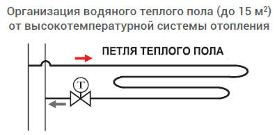 Организация безнасосного подключения системы водяного теплого пола площадью до 15 м2 к высокотемпературной системе отопления.