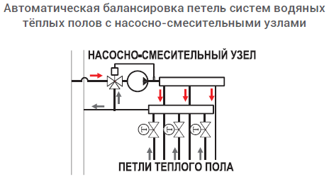 Автоматическая балансировка петель водяного тёплого пола с насосно-смесительными узлами за счёт поддержания требуемой температуры обратного теплоносителя.
