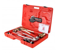 Комплект аккумуляторного инструмента для монтажа аксиальных фитингов включает в себя собственно пресс-инструмент, пресс-зажимы (16/20 и 25/32 мм), расширительные насадки (16, 20, 25, 32 мм), две литий-ионных аккумуляторных батареи (АКБ), зарядное устройство для АКБ (напряжение питания – 220 В, 50 Гц), шнур для зарядного устройства, резак для труб 16–32 мм. Оборудование помещено в кейс красного цвета.